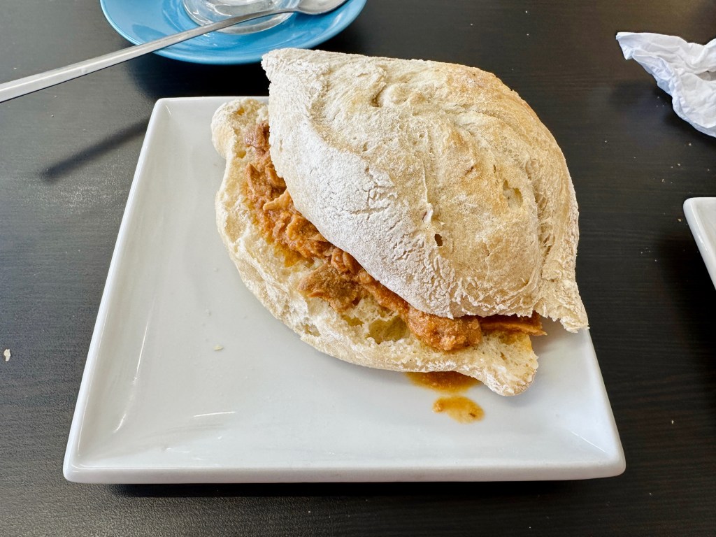 My sandwich choice was difficult but in the end I went for the bifana, lured by those enticing photos I’d seen. This mostly happens in independents, rarely in chains, but what came to my table looked almost exactly like the pictures online and every bit as alluring. A bifana, although there’s some variation across Portugal, is strips of pork cooked in a sauce of beer, garlic and paprika, loaded into a big soft floury roll and eaten like a hungry beast. Okay, that last bit probably only describes my assault on it, but I assure you the rest was very accurate.