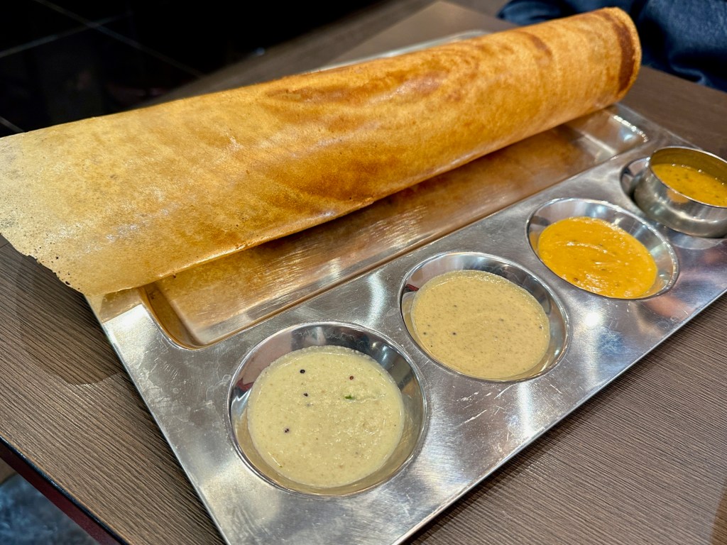 Anyway, the reason I’m telling you this is that earlier in the year – about six months ago – I got messages from Jez and Ken, independent of one another, urging me to put Deccan House on my radar. It’s a little place on Cemetery Junction between the stained glass shop and Ye Babam Ye, ostensibly doing Hyderabadi food: Jez and Ken had gone for dinner there, and both of them were impressed. Jez said it was the first time he’d tried dosa (he sent me a picture, “with my glasses included for scale”). Ken said that although it was a very different proposition to Clay’s he had really enjoyed the food.