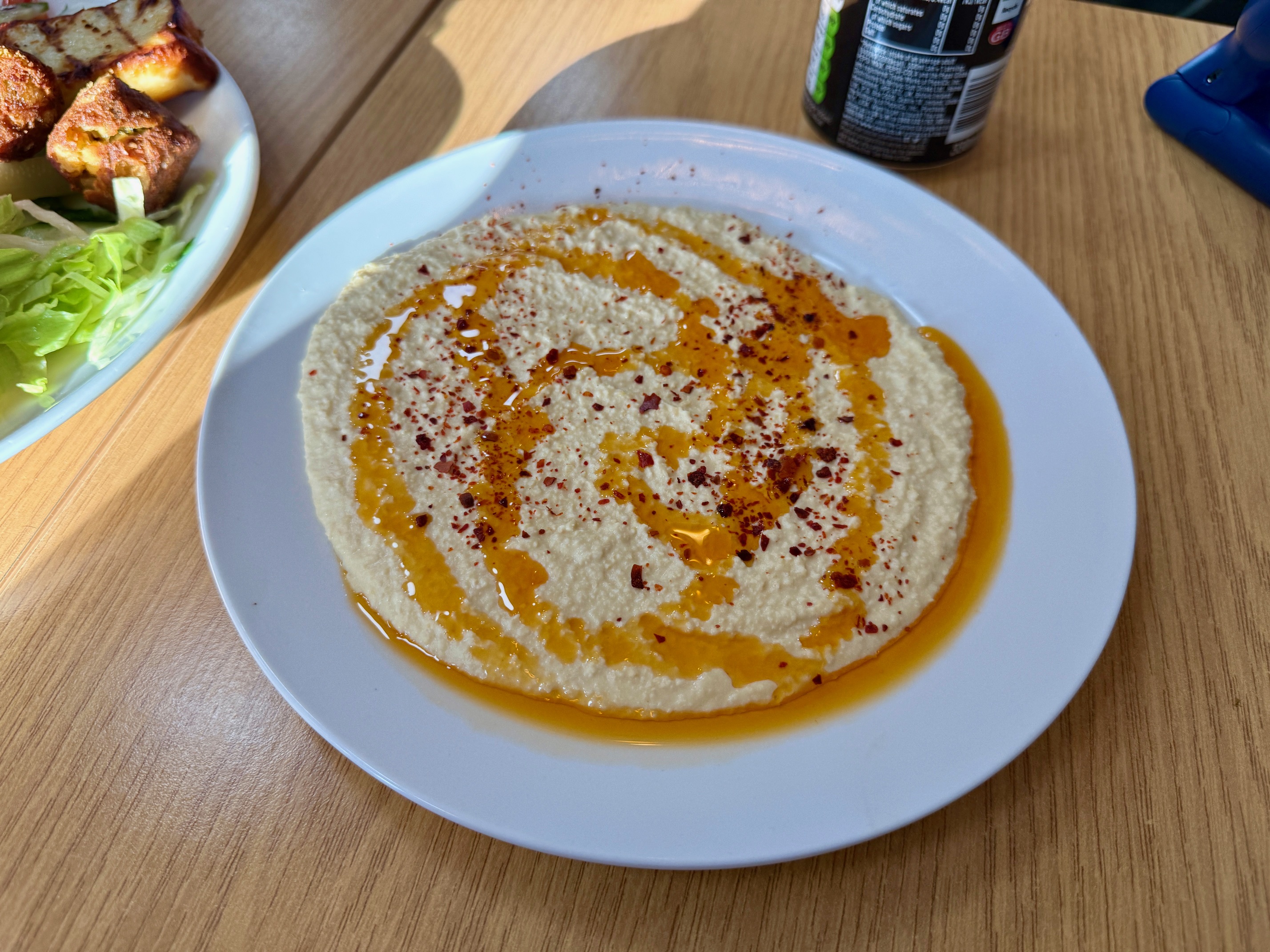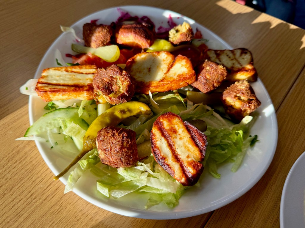 They didn’t have my first choice of starter, sigara boregi, little crispy rolls filled with feta, so instead we picked a few other things, along with what the menu referred to as “Turkish Bread”. First to turn up were our halloumi and falafel, plonked on the counter for us to come up and collect. It was a glorious early evening, one of the first truly sunny days we’ve had, and diagonal rays of light illuminated the plate in front of us.