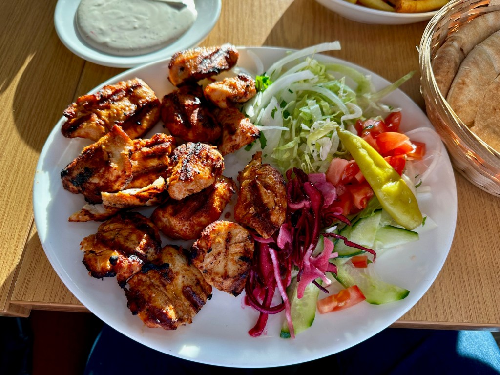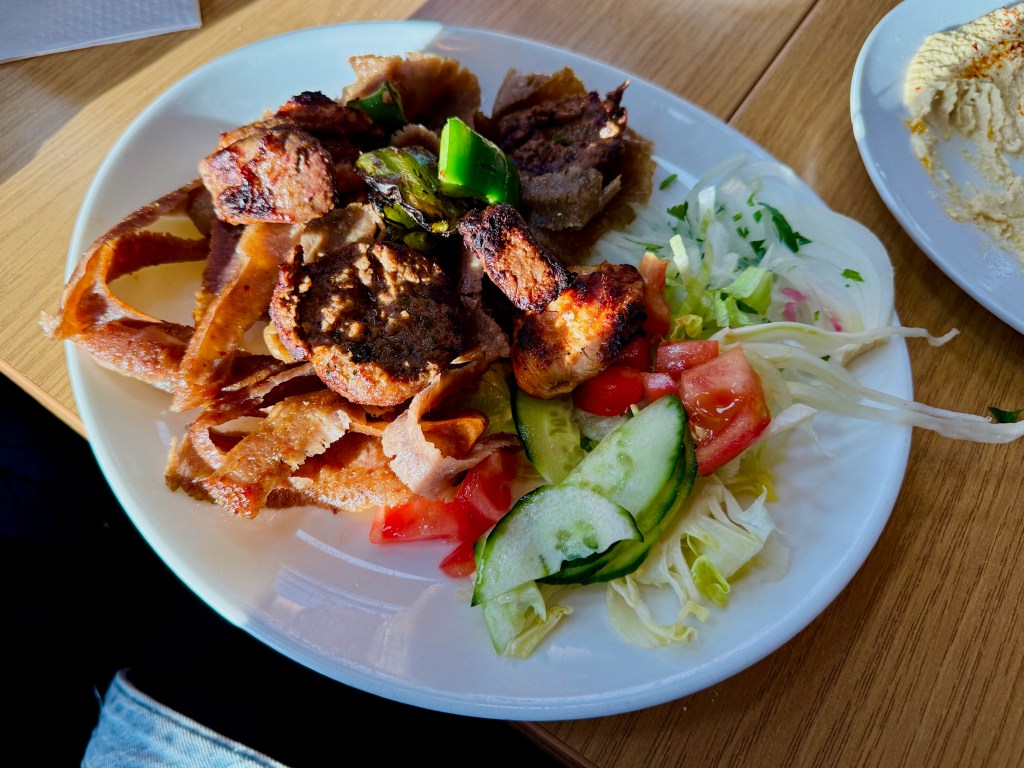 Ditto the dish a chap was having at the table next to ours that I couldn’t see on the menu, seemingly two bits of roasted chicken with what looked like slow-cooked potatoes. It might have been gorgeous, but to have it one day I would have to pass on the chicken shish. I know myself well enough to know that was unlikely to happen.