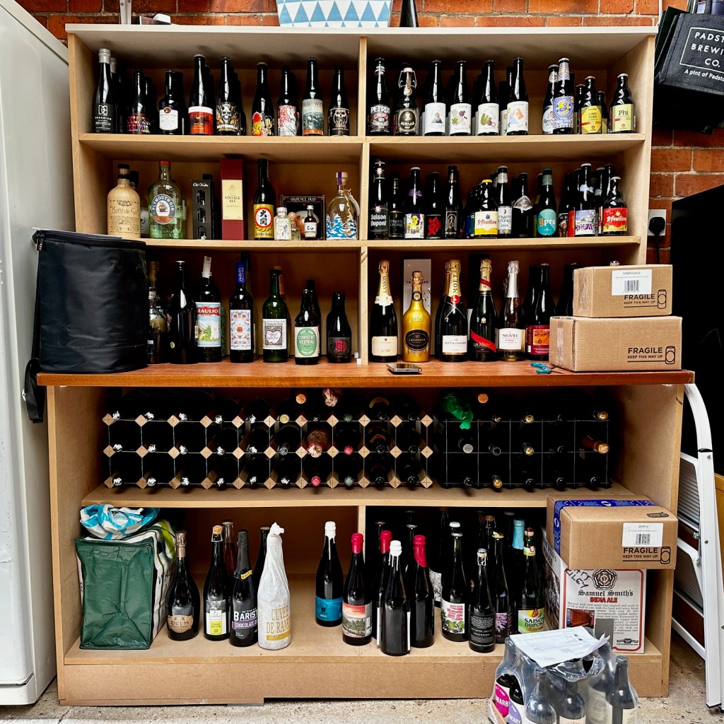 I don’t know when I got a garage that looks like a branch of Oddbins: it just kind of happened. I used to have a basement at the old house, and Zoë moved in and then next thing I knew she was buying racks off eBay and turning it into a beer repository. Then came the fridge, humming away and full of IPAs. I knew there were also boxes and crates of lambics under an old coffee table, ageing better than I have, but I’m not sure I realised the enormity of it.