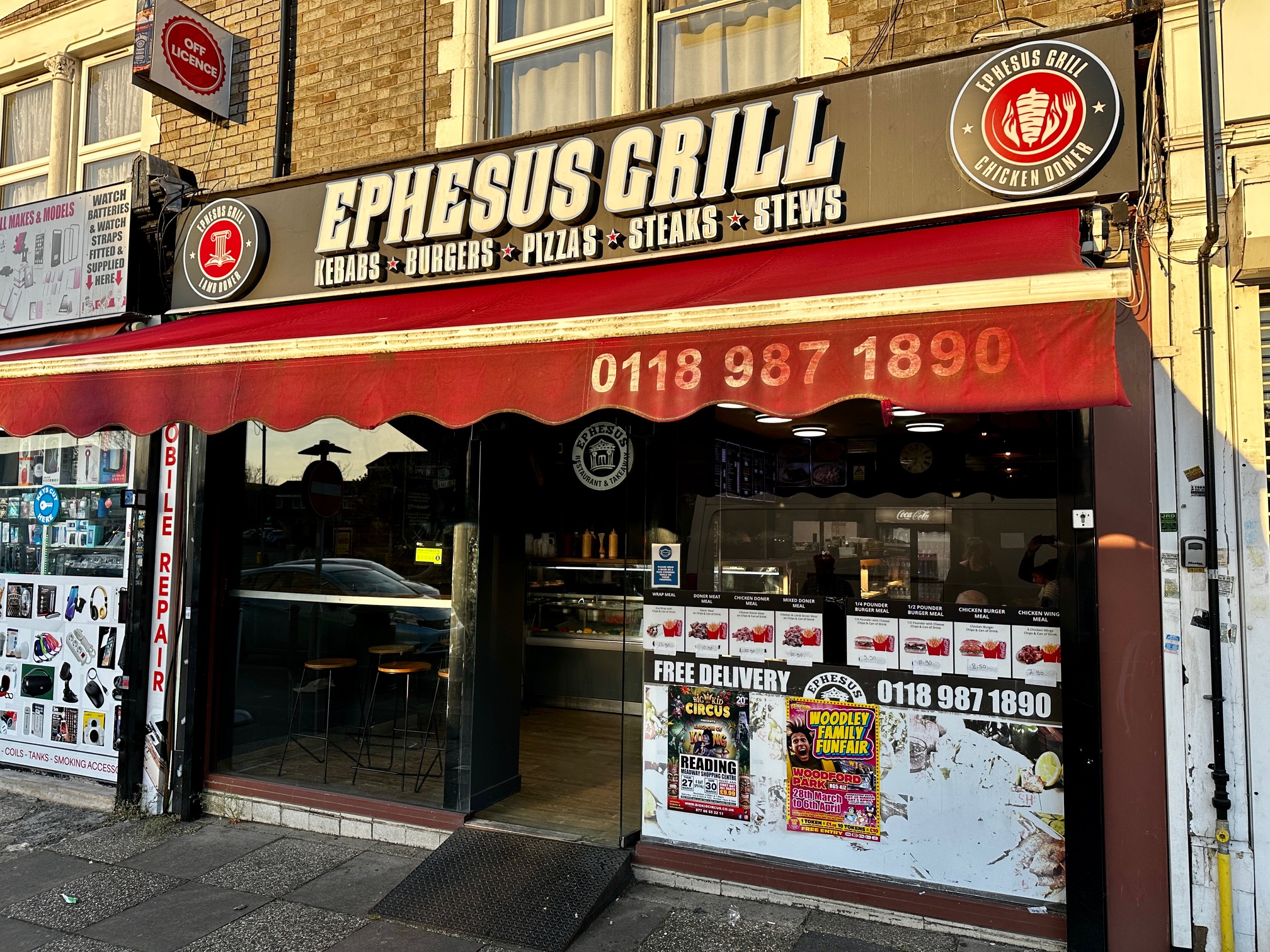 Close to the bottom of Whitley Street, where the road forks into Southampton Street and Mount Pleasant, Ephesus Grill looks unprepossessing. The shop front randomly advertises KEBABS, BURGERS, PIZZAS, STEAKS and STEWS, possibly the only time I’ve seen a restaurant lead with those five. You can barely see in through the windows for the posters for funfairs and circuses, the ads for meal deals stuck up against the glass, prices updated with a Sharpie.