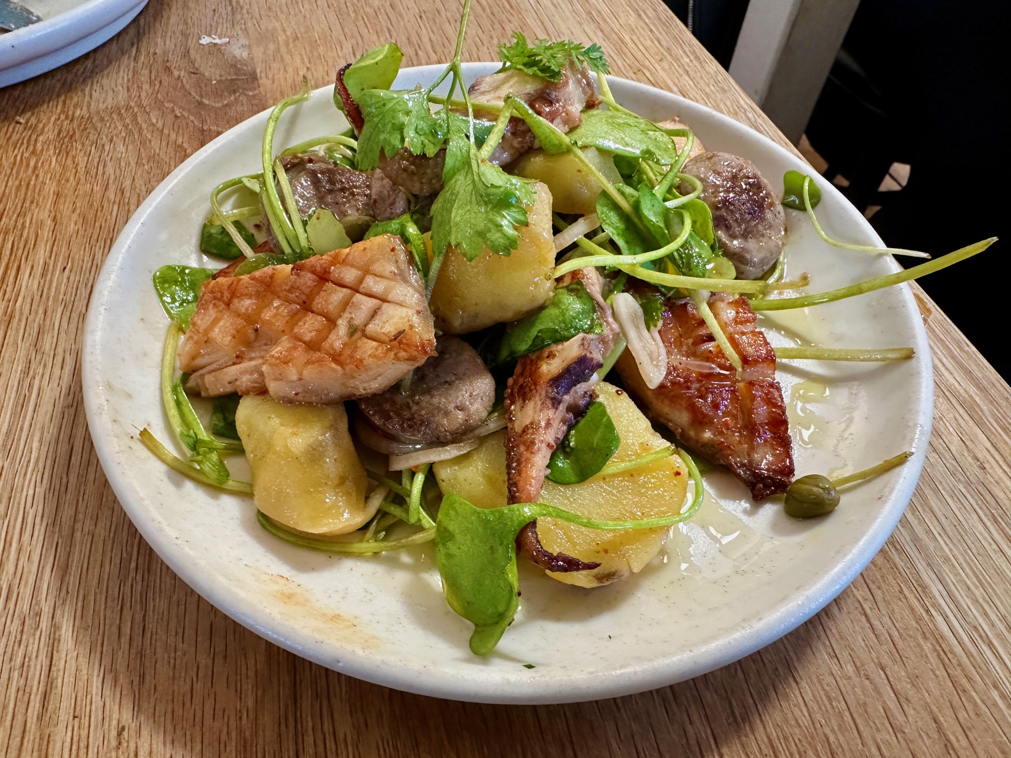 Although you could just as easily have said the same about the third dish we shared, the cuttlefish and sausage salad. Rarely have four words so comprehensively undersold a dish as they did on the menu. I mean, yes, it was a salad and yes, it contained cuttlefish and sausage. But that didn’t begin to do justice to what I’m already sure will be one of the most enjoyable dishes I eat all year.