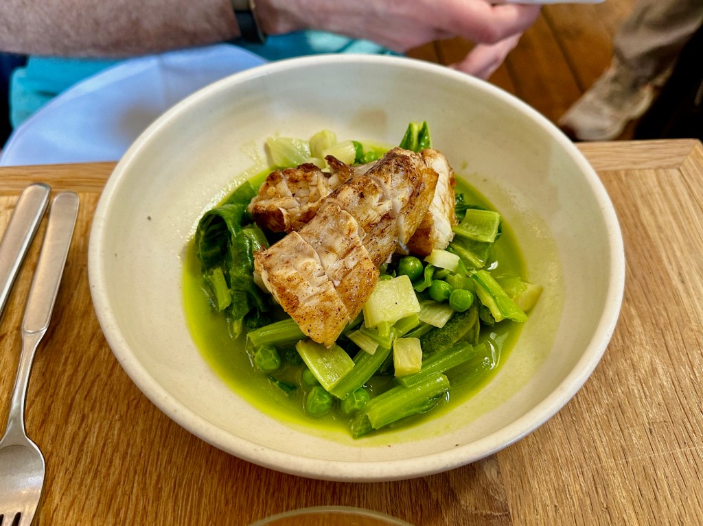 Although Dave was a little sad about the paucity of meat on the menu, those nubbins of sausage aside, he did console himself with monkfish, one of the meatiest denizens of the sea. And again, trust in Upstairs At Landrace was richly rewarded: this was a phenomenally cooked, very generous piece of monkfish with a beautiful colour, effectively cut into medallions. It came on top of a primavera riot – leeks, peas, celery, all the good stuff, bathed in what was apparently a pastis butter.