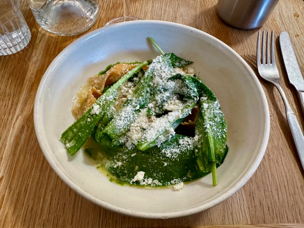 My main, on the other hand, was a symphony of a dish. Agnolotti filled with Jersey Royals could have been starch on starch overkill, but instead were little pockets of silky comfort, the pasta with just enough bite and the filling, pleasingly, with no bite at all. The whole shebang was positively awash with brown butter and wild garlic pesto, because of course it’s the season now, and if that wasn’t enough there was more wild garlic on top. And if that wasn’t enough there was a mountain of cheese, and if that wasn’t enough a dish with more of it was left at the table for you to sprinkle with abandon.