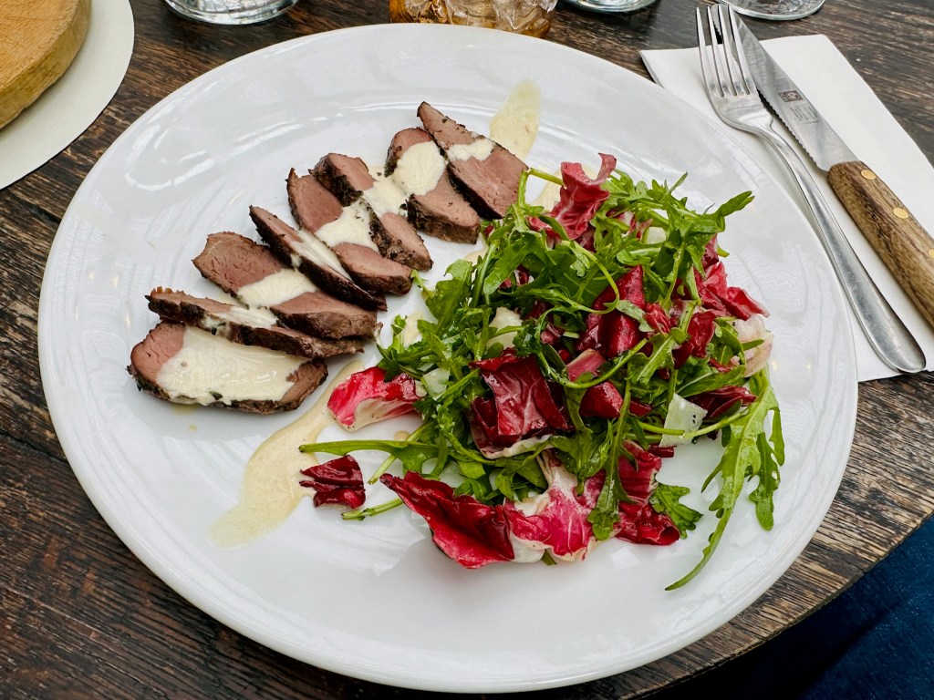 Instead of thinly sliced venison, you got a piece of venison fillet, cooked through without pinkness, thickly sliced and drizzled with a pale sauce that contained absolutely no tuna. Not the slightest hint of it, not even a whisper of tuna. I don’t know what it tasted of – not a lot, really – but it meant that both the main ingredients of vitello tonnato were missing, replaced with things that were damage not homage. And then there was a big pile of salad, because this starter cost fifteen pounds and they had to find ways to distract a paying customer from realising that this wasn’t in any way what they had ordered.