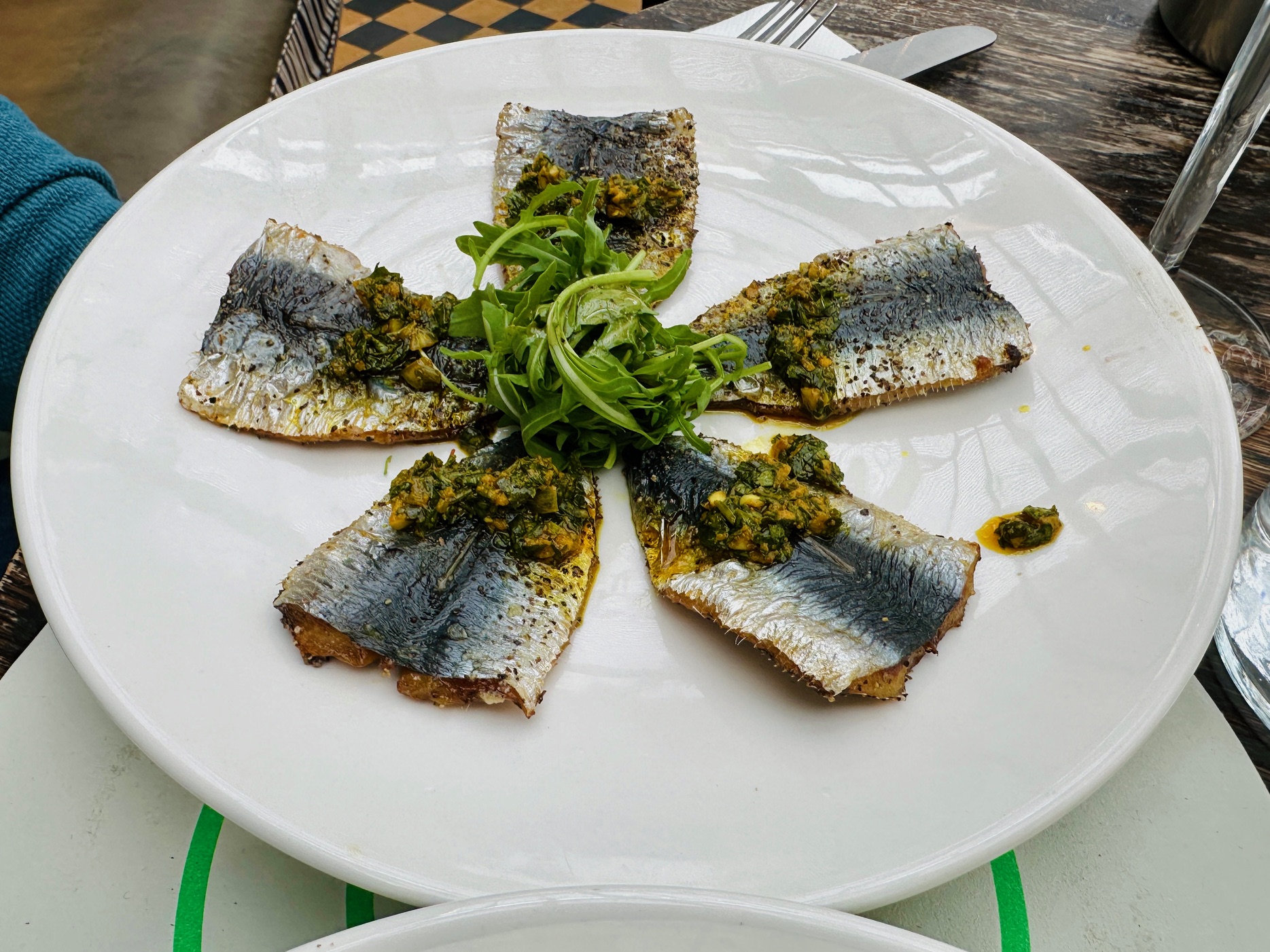 Jerry is on some kind of medication that reduces his appetite (although, gladly, not where booze is concerned). He quite enjoyed this, but I think you’d have to be on that medication to find it enough. And Jerry’s drug regime came in even handier with his main course: butterflied sardines, which apparently came with tomato, sumac pickled onions and chermoula.