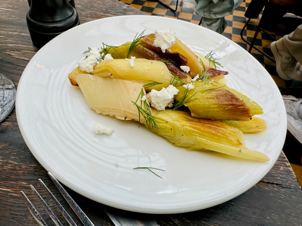 No side dish could rescue this sorry affair, though in Gees’ defence their braised leeks in feta and dill, served warm, were delightful. I’m no fan of dill, generally, yet I loved this dish and at six pounds it was better, and better value, than nearly anything else we ate. About the same size as those sardines too, come to think of it. It was a beautiful lipstick – applied to a pig, yes, but a beautiful lipstick nonetheless.