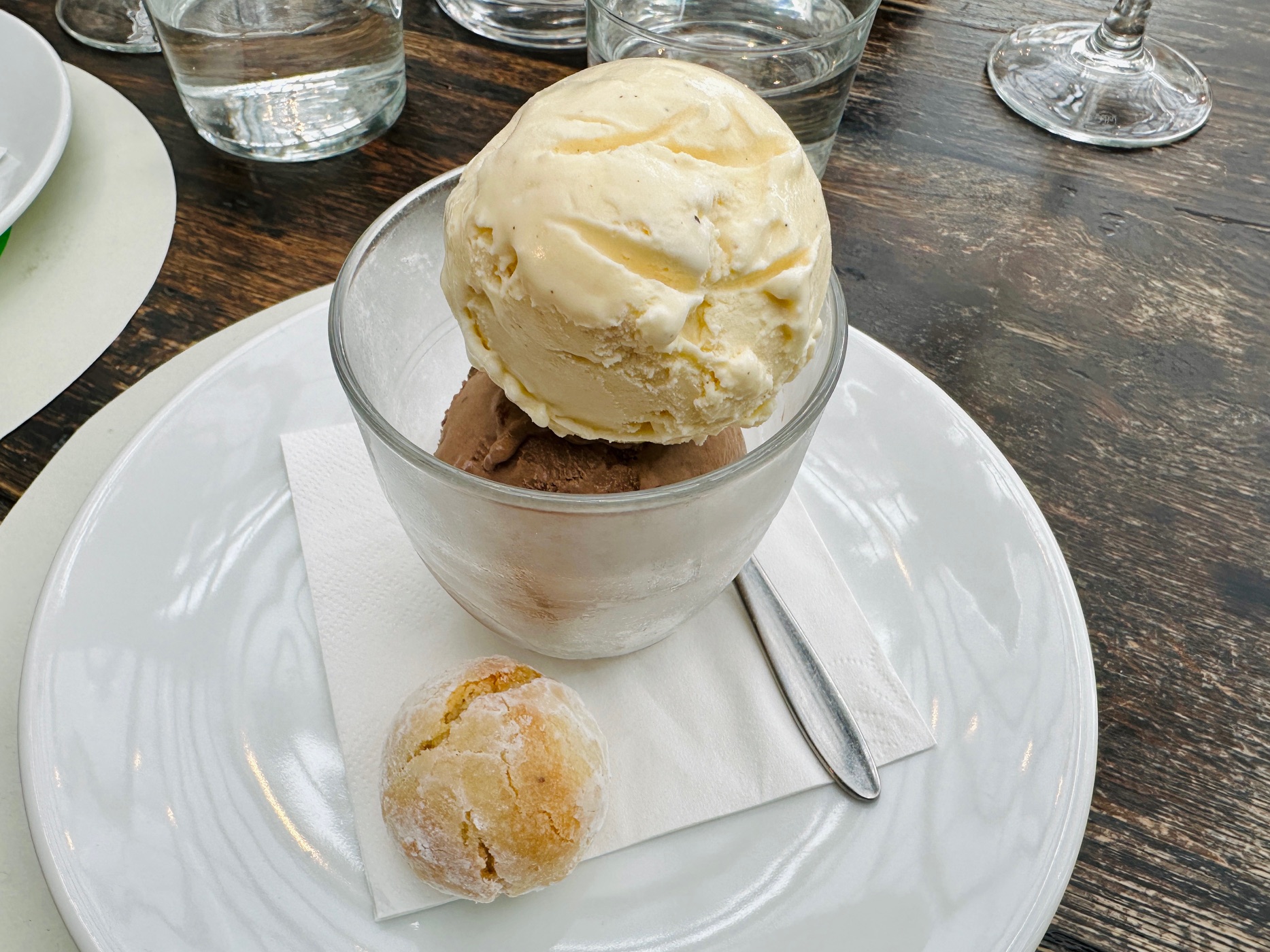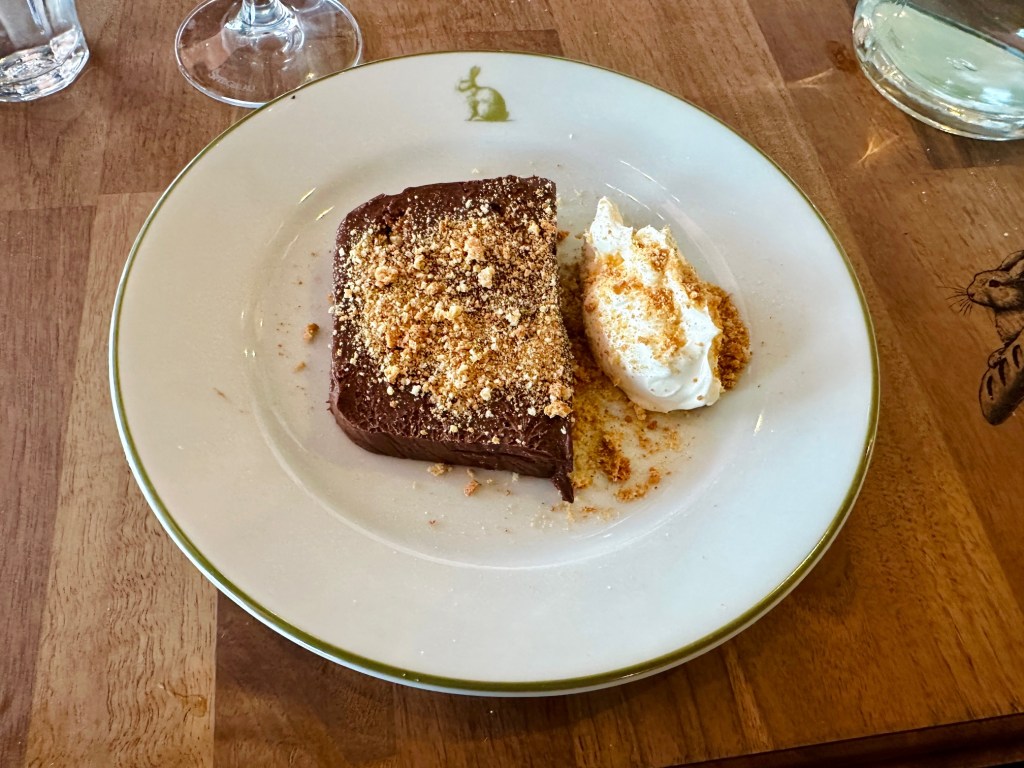 We tried a decent range of the desserts. I think on this occasion Al and I chose best with the St. Emilion au chocolat. I’ve never heard it called that before but it was an extremely nicely done ganache, a not ungenerous portion of it, topped, I think, with crumbled amaretti biscuit and served simply with terrific crème fraiche. I was always going to gravitate towards this dessert and, however good the others were, I would struggle not to order it again.