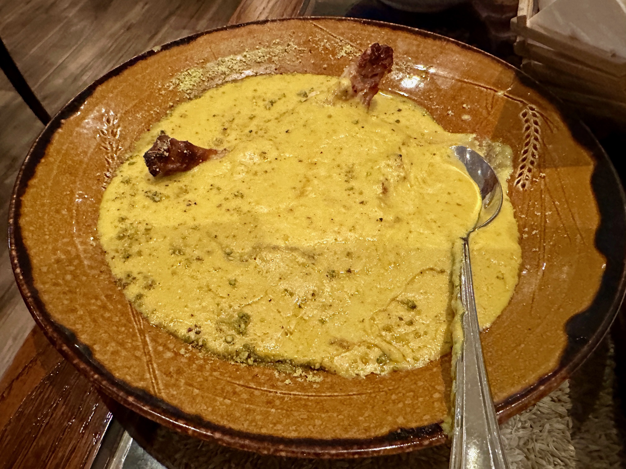 In terms of bold textures it was a couple of pieces of chicken, a supreme at a guess, bone still on, that had been cooked in a tandoor, cut into chunks and then submerged almost totally in the sauce. It looked, I’m sorry to say, like a cat had hurled on it. I don’t know how you made a dish like this more visually appealing – that may be impossible but if it is, I think you at least need to find a way of making it less unappealing.
