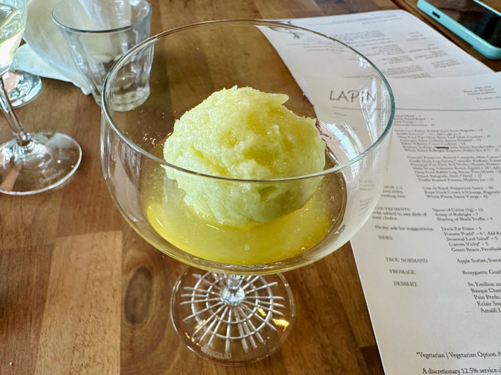 As it happens, I found that wine the following weekend in Montpellier at the wine shop round the corner from our B&B. We bought a bottle and again that means I got a good idea of Lapin’s markups, which are considerable. But perhaps that misses the point, and perhaps ordering a whole bottle of something does too: one of the things that is genuinely impressive about Lapin is that its whole wine list is available by the glass. Someone has spent a fair amount of money with Coravin, and it gives you an enviable range of choices compared to most restaurants I can think of.