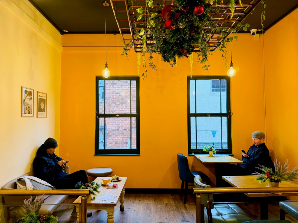 No matter: the coffee, the starting point, wasn’t half bad. It arrived in those tall, almost-conical glasses I slightly associate with the last century, but my latte was very enjoyable and Zoë liked her mocha. In Reading’s coffee hierarchy this wasn’t competing with the likes of C.U.P. or Lincoln – or even trying to – but it was significantly better than Madoo‘s coffee, which has always been its Achilles heel.