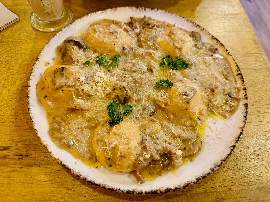 I’m afraid to say, though, that the pizza beat the pasta hands down. I’d chosen ravioli – made fresh every day onsite – rather than gnocchi, and the porcini mushroom sauce over the ragu on the recommendation of others. And again I wonder if my antennae were just out of kilter that day, because I did not like it at all.