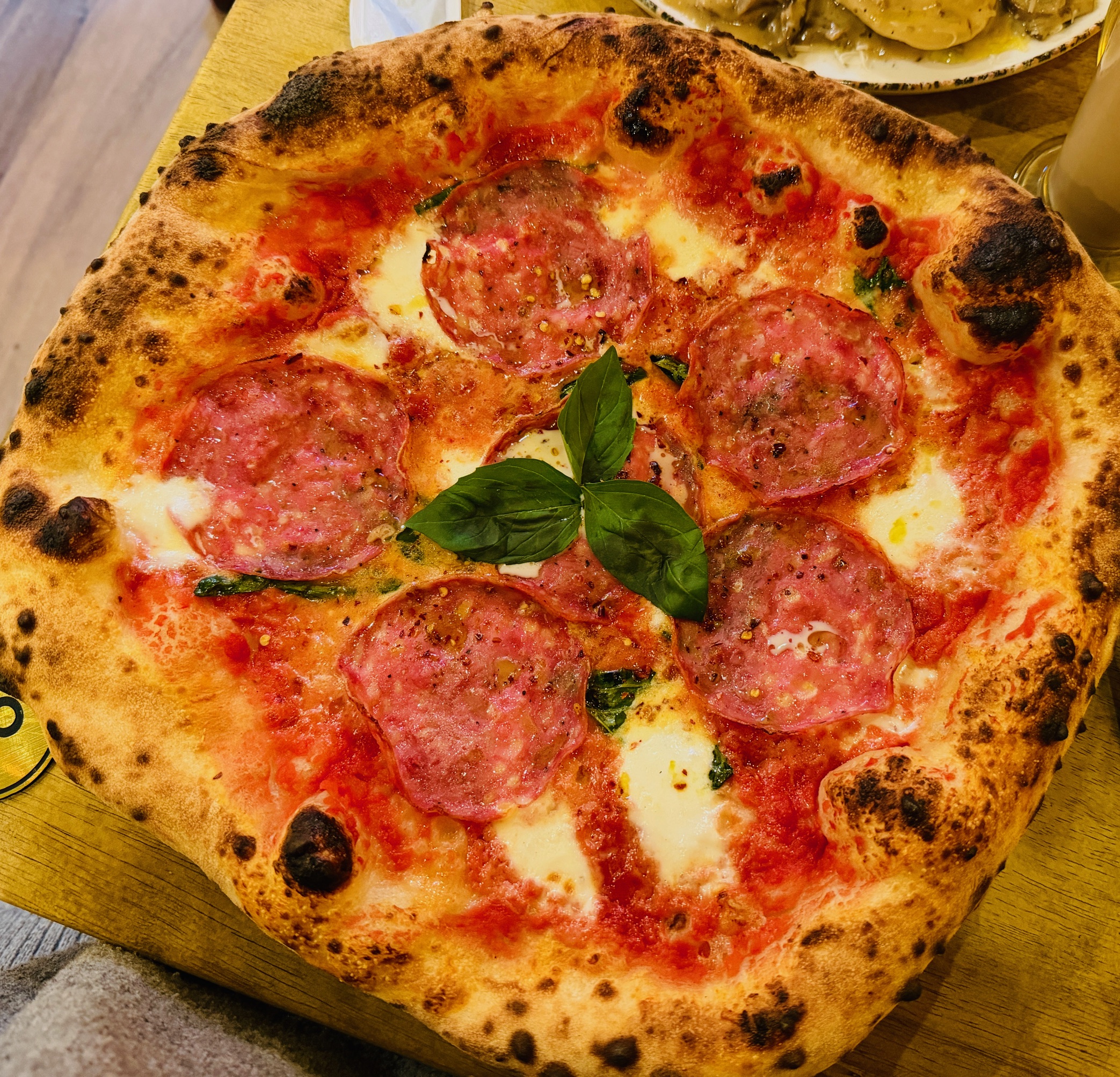 The timestamps on my and Zoë’s photos tell me that our bigger dishes arrived less than five minutes later, and it’s good that we’d finished our smaller ones or there wouldn’t have been room on the table for everything. Zoë called shotgun on the pizza, and had ordered simply, the Diavola, a relatively classic pepperoni pizza with chilli.
