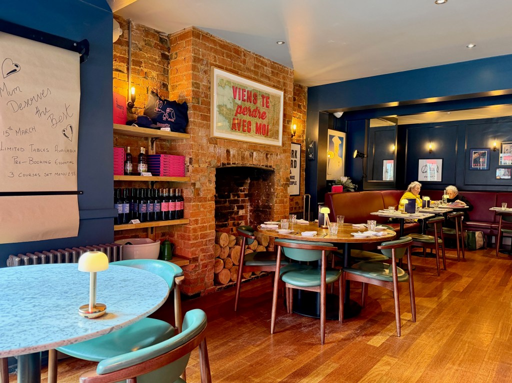 But Pompette always hovered high on my Oxford to do list, and as Jerry and I ambled through the door bang on time for our reservation I was reminded why. It’s a big space but a very, very attractive one, split into two large dining rooms with space up at the bar and a private dining room upstairs. It’s impossible not to love, with the exposed brickwork, calming deep blue walls, gorgeous framed prints and handsome furniture: even the shelves of merch – cookbooks and tote bags – are appealing.