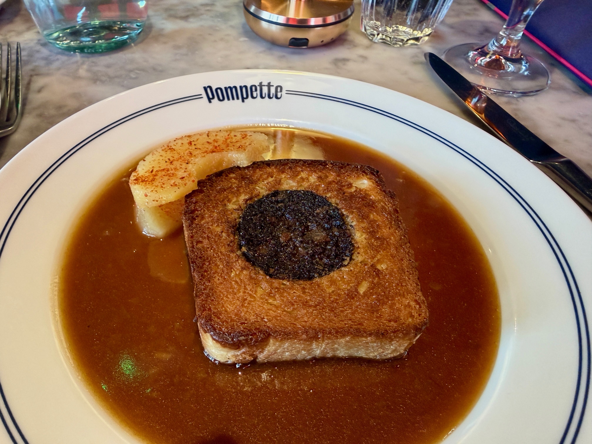 But really, this was one of those plates where, for as long as it’s in front of you and some of it remains, the world is a kind and happy place. When I think about what it was like, I can only remember eating anything comparable in France and when I described it to my boss the following week – he is a keen Oxford fan, especially of the Daunt Books just round the corner from Pompette – he said “so it was sort of like an incredibly middle-class hot dog, then”. Well, no. No but also yes.