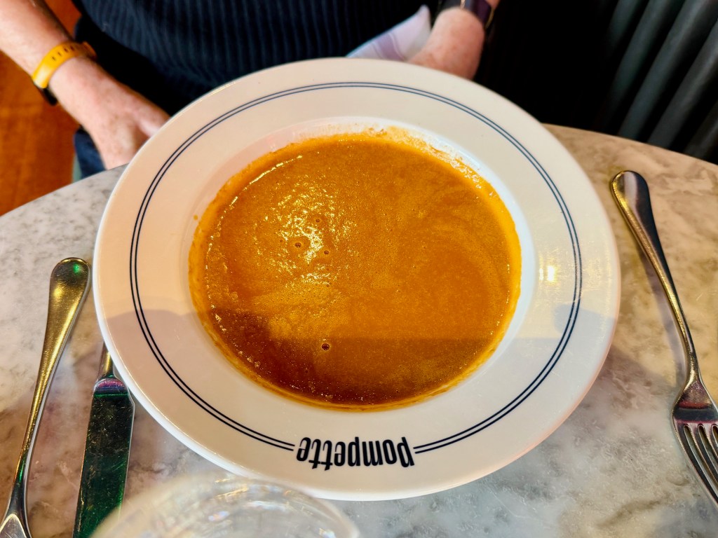 Jerry was determined to conquer the gastronomic spectre of his trip to Gran Canaria, where he trudged through a very disappointing fish soup, so he braved Pompette’s soupe de poisson. But, spoiler alert, no bravery is really required when you order somewhere like Pompette. At Pompette, it is all about everything – from the cooking to the eating to the meal itself – taking absolutely as long as it needs to take, of perfecting over time and reducing to an epitome.