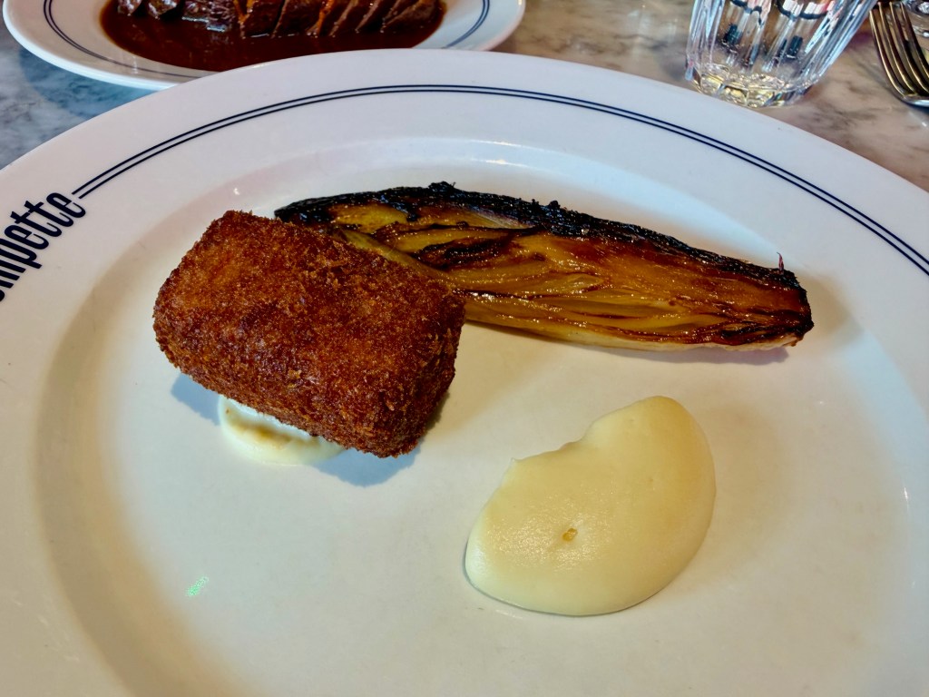 Pompette’s menu is ostensibly French – chef Pascal Wiedemann hails from the Alsace, although he made his name in London at French restaurants Racine and Terroirs – but it wanders well beyond the Alsace and, to be honest, beyond France’s borders too. I’ve had vitello tonnato there before, and the menu the day Jerry and I visited boasted stracciatella, pumpkin gnocchi with Gorgonzola, boquerones with Manchego and croquetas; in that sense it’s almost the same ball park as the sleek pan-European fare at Branca. There’s also hispi cabbage, which very much places it as a restaurant in the U.K. in 2026.