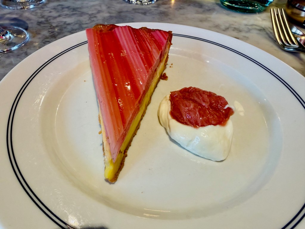 It was an absolute joy – a mild custard with just enough wobble, an acceptably thin pastry base and a gorgeous lacquered, almost tiled top level of rhubarb. I’m not used to being given a knife and fork for dessert but this dish did need it, because the rhubarb still had fibre and resistance, and otherwise would have slid clean off the rest.