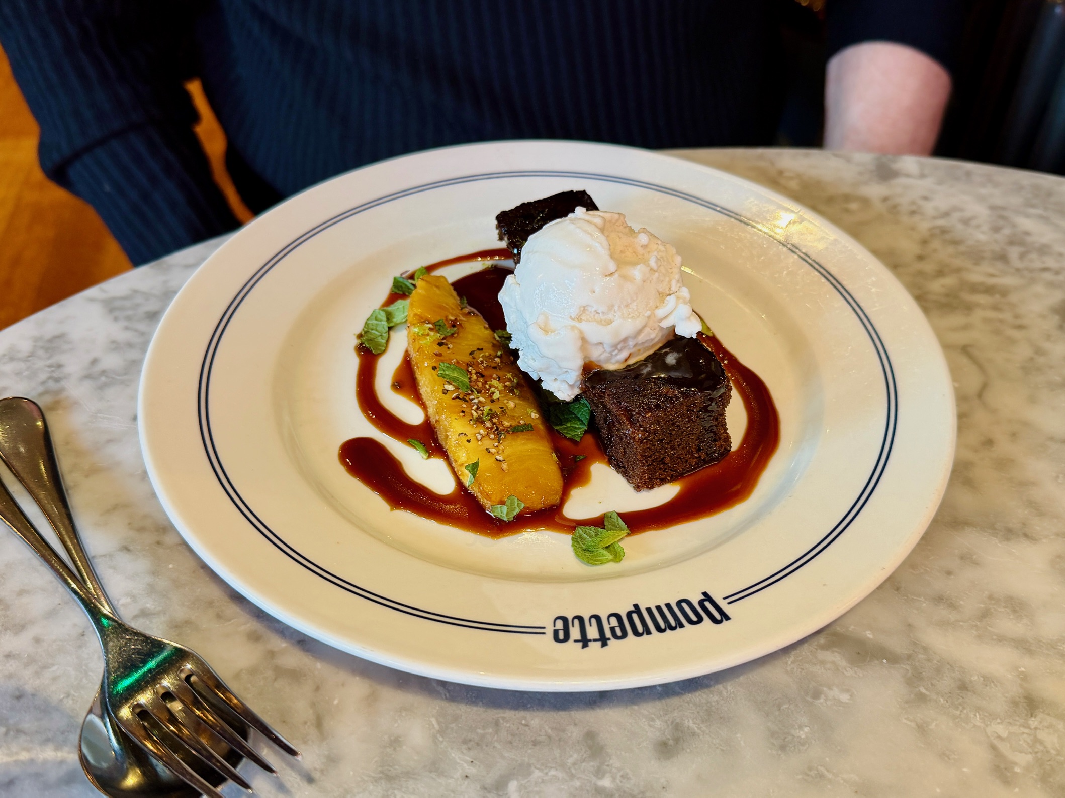 But fortune favoured me and Jerry, in the shape of the most beautifully cooked duck breast swimming in a thick, glossy bigarade sauce – more of that bitter orange from my apéritif – and festooned with rind. Again, Pompette’s preturnatural talent with sauces was deployed to stunning effect: I think of all the cuisines out there French is my favourite, and it’s because of things like this. They are the clincher.