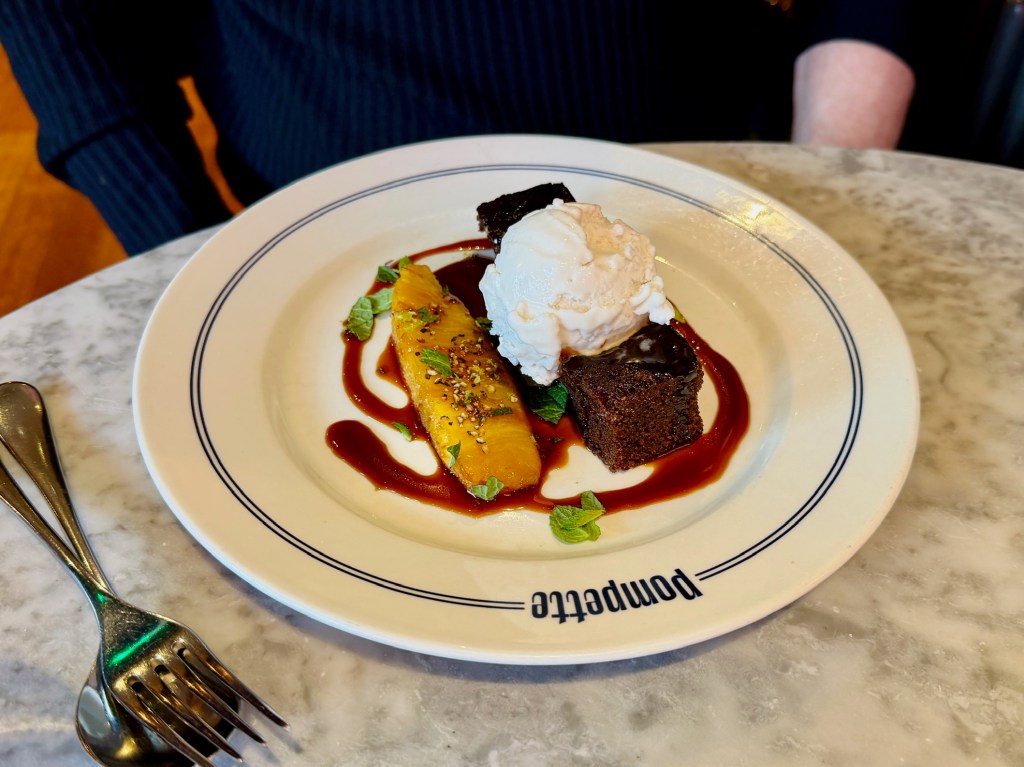 By this point we had polished off a bottle of red that was a new one on me, a Vinsobres from the Rhone Valley. The wine list was absolutely magnificent, and will part you from plenty of money if your resolve weakens for a moment. Our server recommended a handful of reds from Jura’s legendary producer Tony Bornard, and they all sounded right up my alley, but I struggled with spending £100 on one: to Pompette’s credit, most of them are £50 retail so that markup is positively encouraging. But again, our server was superb at navigating us to something more kindly priced – £54, with a more conventional markup – but quite exquisite. We swirled it in huge, fishbowl-like glasses, and enjoyed every drop.