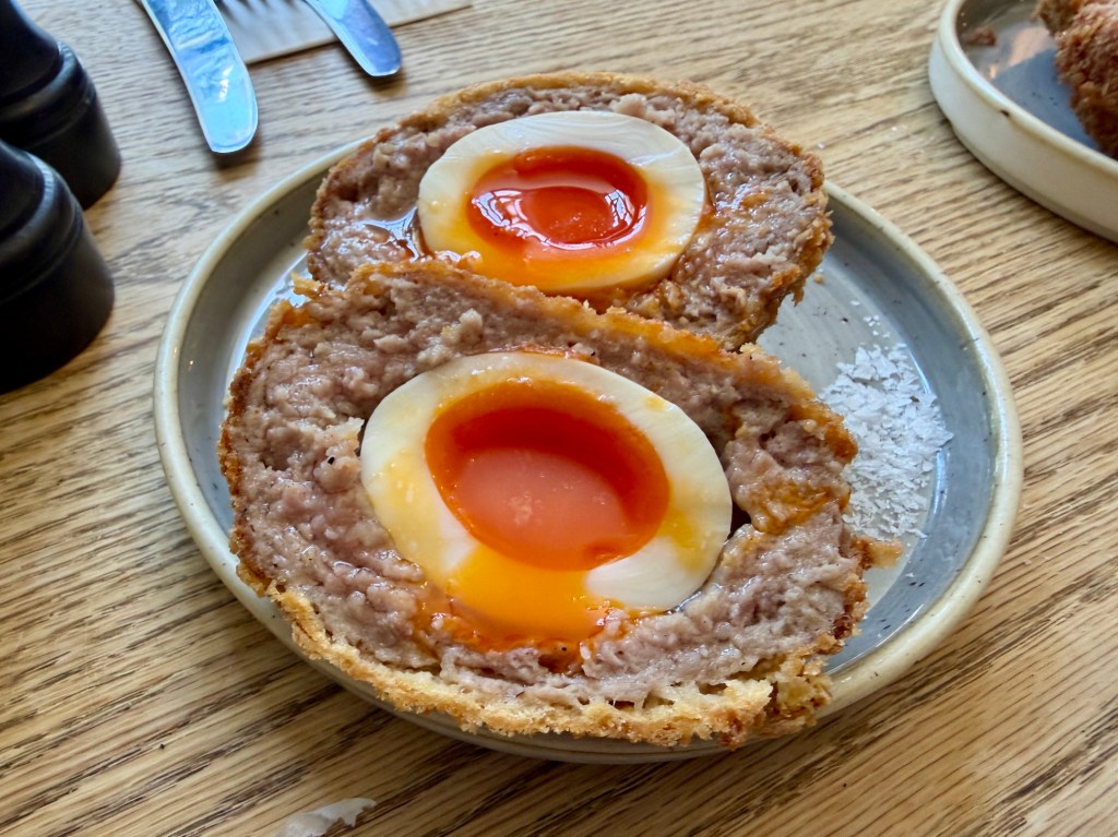 Now, on to the food – and before you judge, I’d just like to say again that it was a very particular set of circumstances. First, the Scotch egg. We had two of these between the four of us and I absolutely adored it, the pork coarse and judiciously seasoned, the Burford Browns spilling golden secrets, a smattering of salt flakes to sprinkle on top. It took me back to the glory days of the Lyndhurst, and made me wish I had a pub doing food like this within walking distance. The yolk was a little runny for my stepmother’s personal taste, the lack of brown sauce or any other condiments won Zoë’s seal of approval: on balance, a palpable hit.