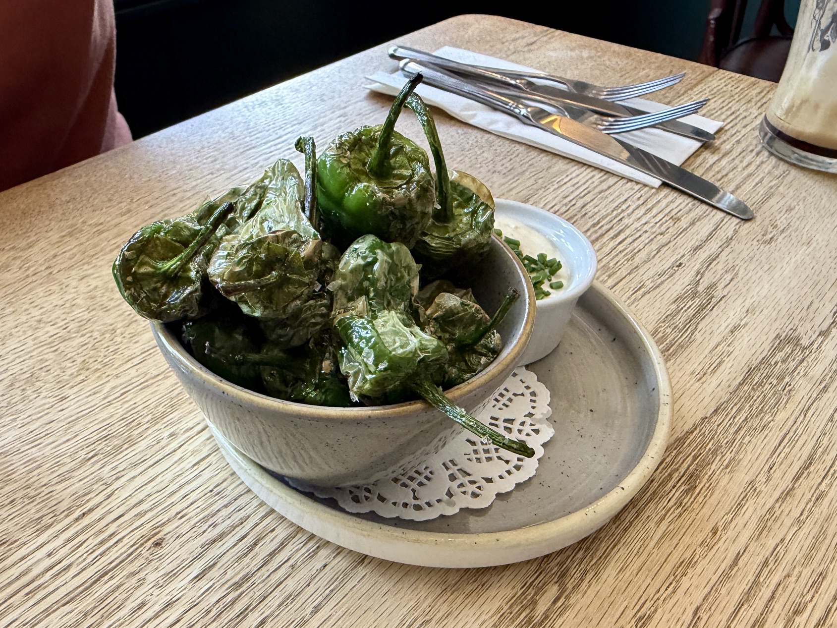 The last of our trio was padron peppers, ordered because Zoë loves them; my stepmother, not unreasonably, said “I can make those at home”, and I’ve always felt I can take or leave them.