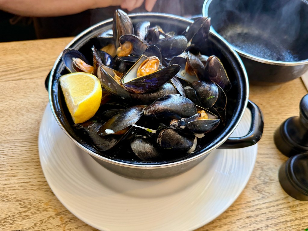 That main was a huge pot of mussels – Welsh, apparently – almost as much still life as treat, gently steaming in their bath of marinière sauce. They were pronounced triumphant and my stepmother worked through them with what looked to me like a combination of diligence and joy. You could have a smaller portion as a starter with what the menu winningly refers to as “mopping bread” or a larger one with fries.