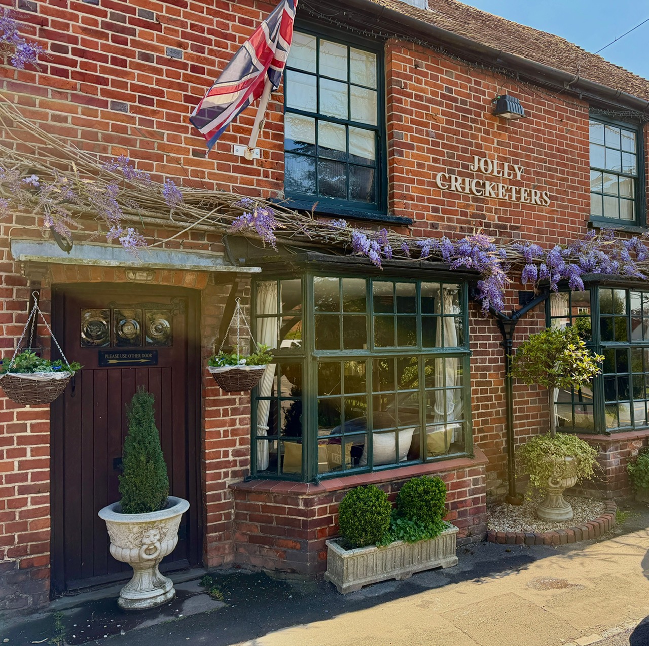 It’s just over a five minute drive from Bekonscot to Seer Green, proudly proclaimed on the signs as “The Cherry Pie Village”. It really is a gorgeous place, and the Jolly Cricketers is in a beautiful spot one side of the churchyard. Even the church, in the sunshine, was delightful: tables and chairs out in case you wanted to stop and rest, a cafe inside with its own Instagram account. And the pub was a picture postcard perfect spot, wisteria running along the top of the racing green window frames. It could easily have belonged in Bekonscot too, if only it had been a lot smaller.
