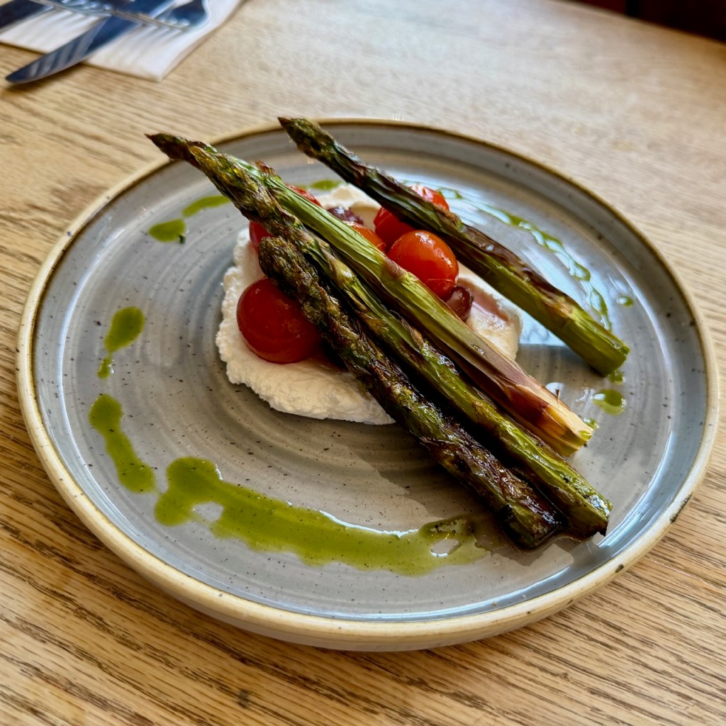 My brother was torn but ended up going for the asparagus. He really enjoyed it, and it had plenty going on with sumac labneh, cherry tomatoes and olives, a moat of the most arresting-coloured extra virgin. I didn’t eat this, so I won’t sit in judgement too much, but just the four spears felt a little underbalanced and it didn’t look like the sourdough crumb made its presence felt. It was the most expensive starter on the menu at £12.50 and I was glad I hadn’t ordered it myself, but for all I know it probably – as wankers like to put it – “ate well”.