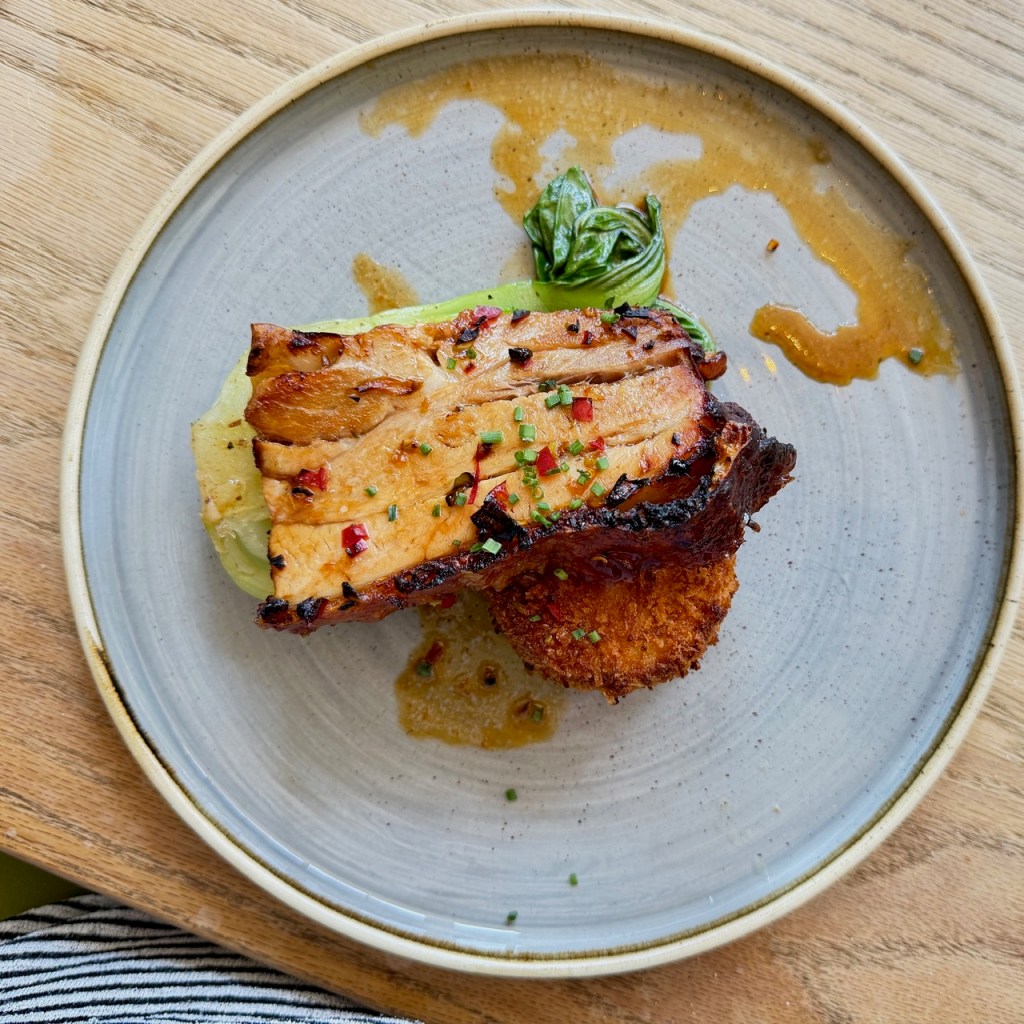 The pork was truly magnificent – a whopping striated slab of the stuff, crispy-edged but yielding at its core, some of the best pork belly I’ve had in as long as I can remember (or at least since the crispy pork earlier on). And the pak choi offered an excellent contrast, cooked absolutely bang on. But I would have liked the crab cake to be a little crispier too, a bit less crumbly and to have more of the ginger that was meant to feature. And it needed sauce to bring it together – a proper quantity of it, not a thin trickle that had made its way to the perimeter of the plate, like it was trying to make a break for it.