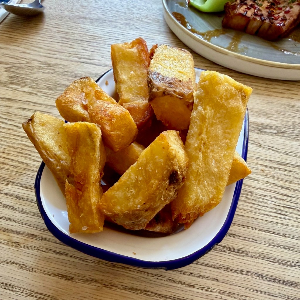 We’d opted for a solitary portion of chunky chips to provide carbs, and in honesty the crabcake was spudded up enough that we probably didn’t need them. But thank goodness we ordered them anyway, because they were textbook: stubby and crunchy, beautifully done with a little side order of rustling scraps in the bottom of the bowl. My stepmother had a couple too, declaring them infinitely better than the fries that came with her main.
