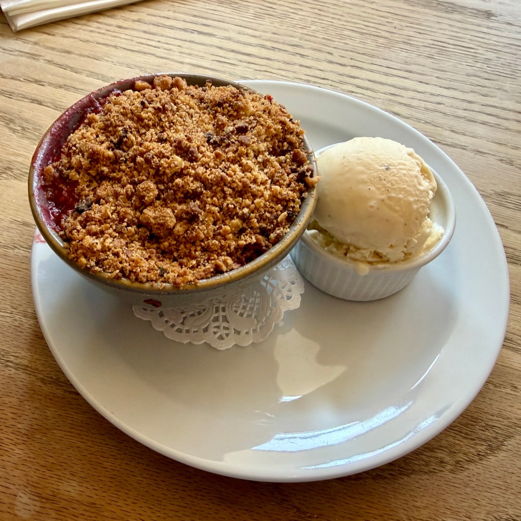 Zoë couldn’t resist crumble, having seen it on the menu, and she rhapsodised about her order. It was apple and blackberry, topped with a gorgeous golden rubble of biscuit, served with an ice cream resplendent with vanilla specks. It prompted a big discussion at the table about the acceptable crumble to fruit ratio: I, conditioned by the Royal Berks no doubt, thought it should be 2:1, while my stepmother would have preferred it the other way round. Zoë, ever the moderate, liked it best 50:50. Which was this, I asked her later? My stepmother would have loved it, she told me.