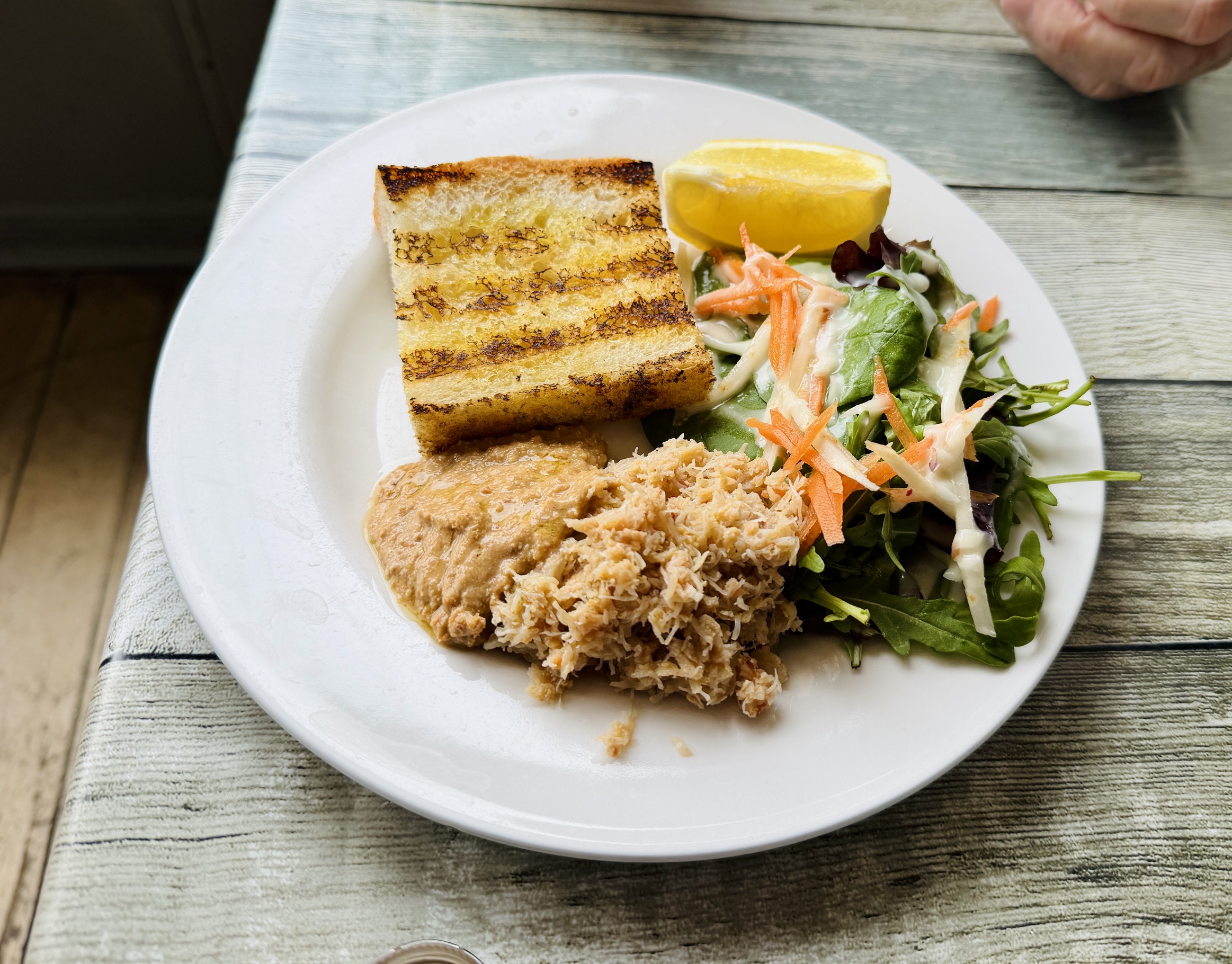 “This is so much nicer than those meagre pots you get at the supermarket” enthused Jerry, and he was right. I love the purity of white crabmeat but the dark meat is where the flavour is and this was rich and thought through, with a slowly building heat in the mix which, again, you might not expect. Even the tiger-striped block of toast was considered, was the perfect thing to load the stuff onto. I always think salads are padding in a dish like this, and this one definitely was, but even without it this felt like a very creditable way to spend £11.