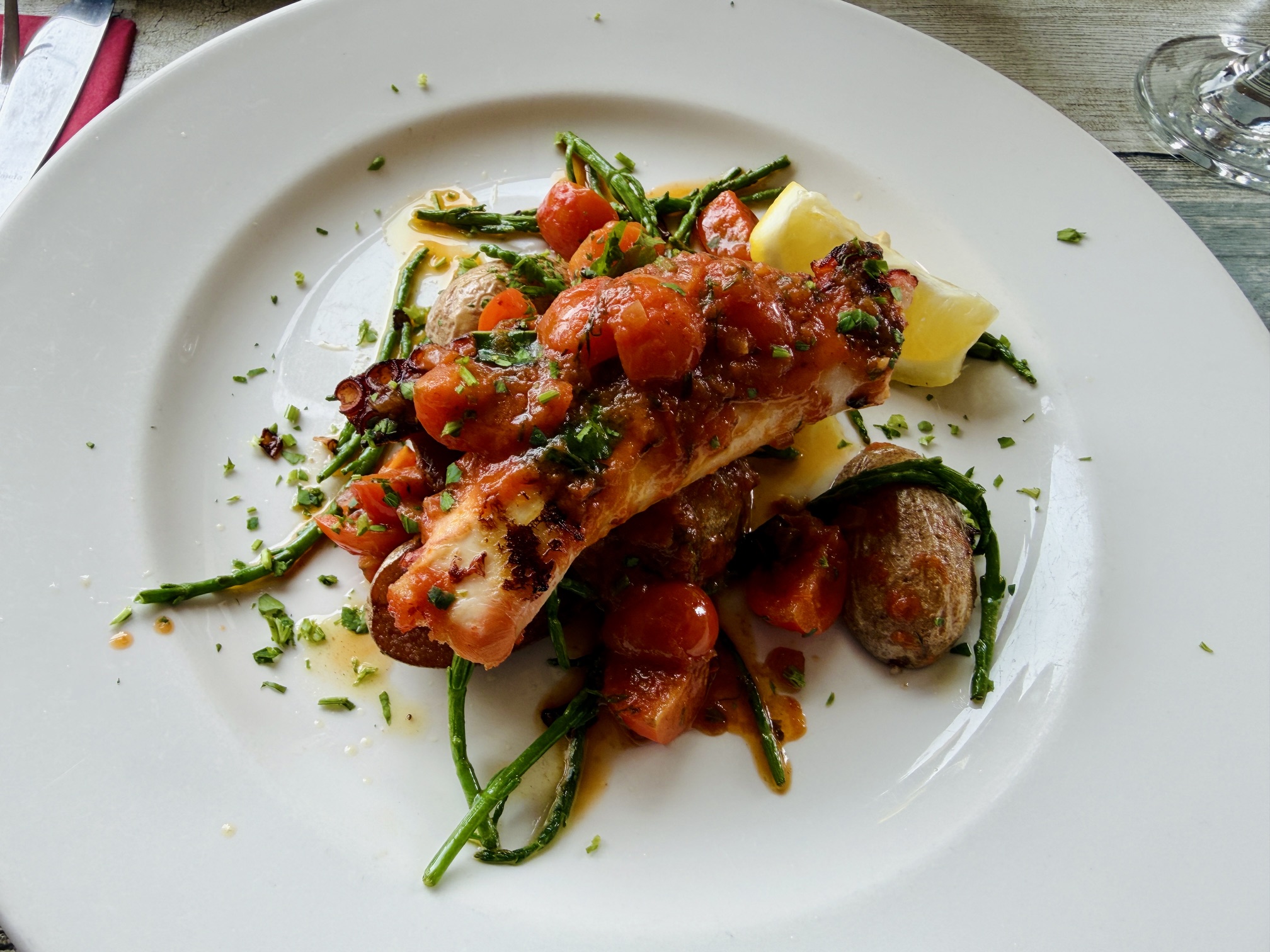 That said, I wish they’d given mine a little longer. The blackboard propped up outside the restaurant had promised two specials but one had already gone by the time we turned up at half-one, so I chose the other, the octopus. And on paper this dish had everything I could have wanted: firm, roasted baby new potatoes with a flash of bronzed skin, a little carpet of still-crunchy samphire, a beautiful sauce with plenty of sweet cherry tomatoes.