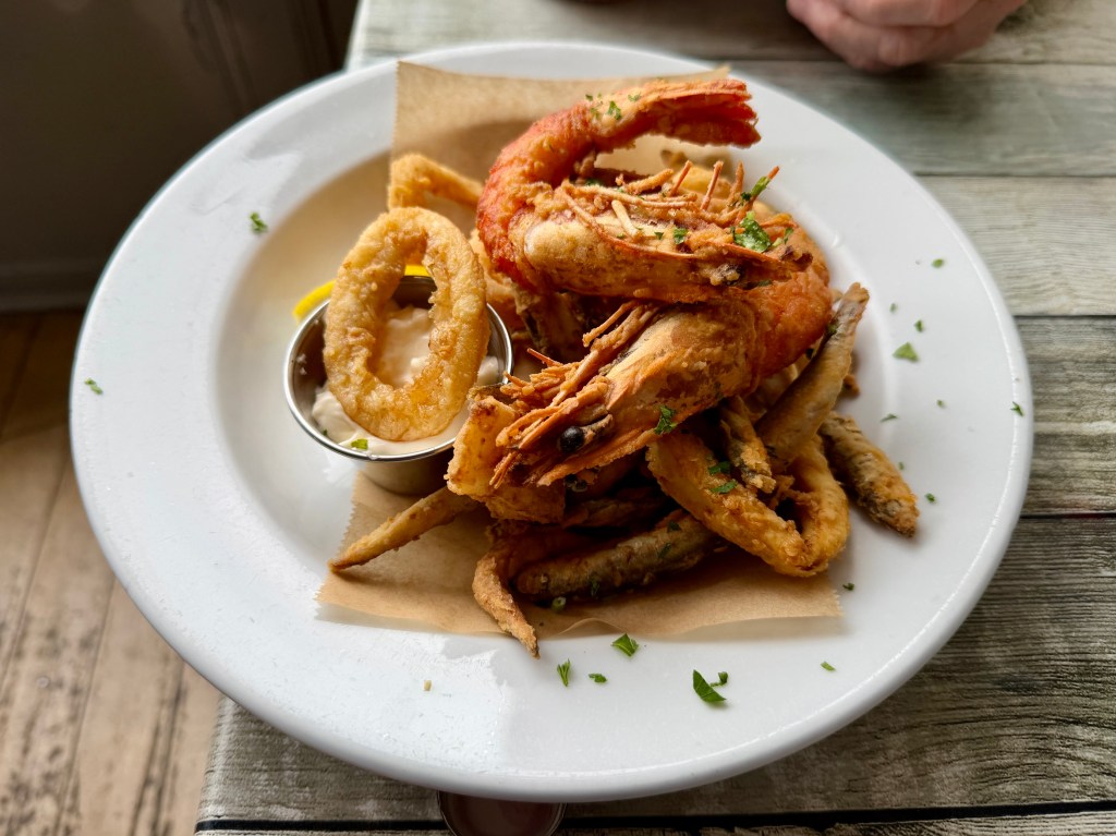 Perhaps, I told myself, it was all in the daily specials depending what they could get that day. But it also felt a little all over the place, with classic fish and chips sitting uneasily next to squid ink spaghetti and “mixed seafood and chicken paella”.