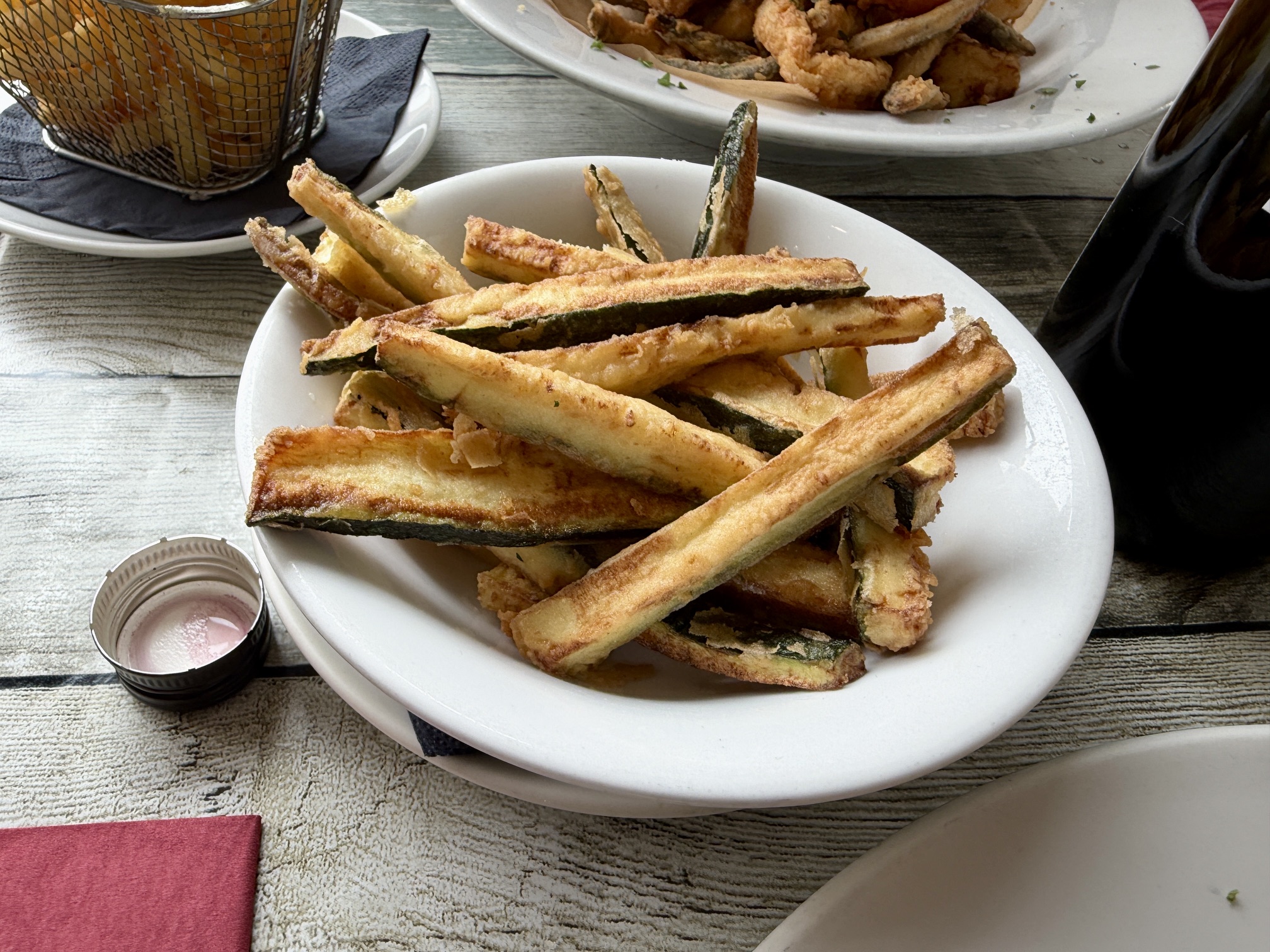 We had a couple of side dishes – Jerry because his main needed one and me because I’m greedy. My zucchini fritti were thick, soggy and under-battered, lacking salt or fun. Jerry’s french fries almost certainly came out of a packet and were served in the sort of miniature frying basket that dreary observational comics on Twitter used to slag off ad infinitum. I didn’t finish my courgette fries because they felt like empty calories. Jerry didn’t finish his frites because he just didn’t have room: I half expected him to apologise to our server for that.
