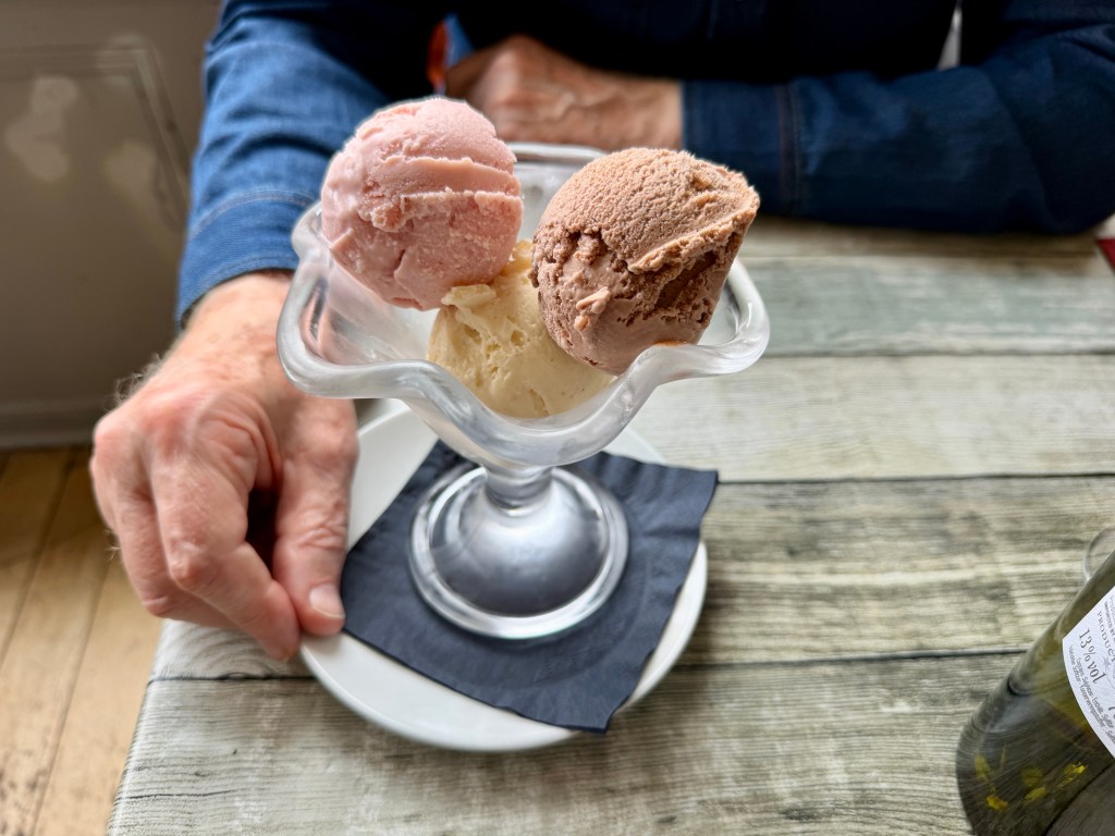 Jerry went for ice cream, a classic Neapolitan trio of chocolate, strawberry and vanilla. I don’t know if they were supplied by others or made by the restaurant, but they were as pleasing as their pastel shades might lead you to believe they would be. A couple of the scoops had ice crystals in them, which strangely left me with the impression they were less likely to be bought in, but either way it was a solidly nice and thoroughly unexciting dessert.