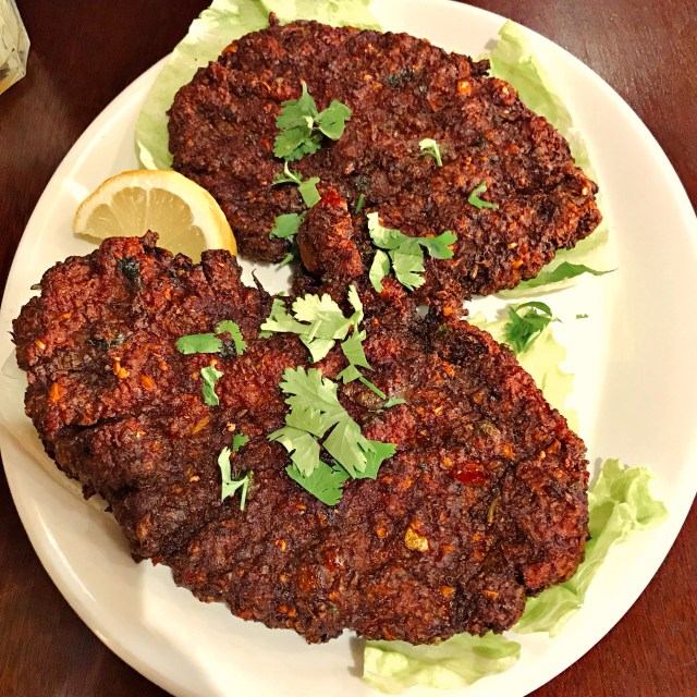 I managed to persuade Martijn to order a starter and three mains to share, and as nobody at Afghan tried to deter us I assumed that our order was deemed plucky rather than foolhardy. The first thing to arrive was a dish I’d been very excited about trying, the chapli kebab. This was the dish Mansoor’s wife had so admired, and it’s been described as the best thing to come out of the Khyber. As a die hard Carry On fan I found this difficult to believe, so I was determined to see what the fuss was all about.