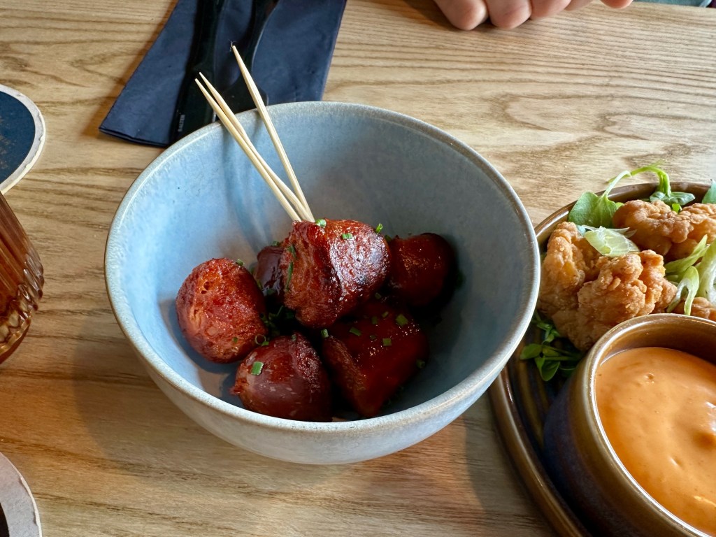 But then we looked at the nibbles and starters and many looked like they’d wandered in from a different menu, one that ranged from Spain to Italy to Morocco, before upping sticks and taking a long flight east. Not only that, but some of the things on it were so eccentric that it didn’t feel like a Brakes van could have been involved in their genesis.