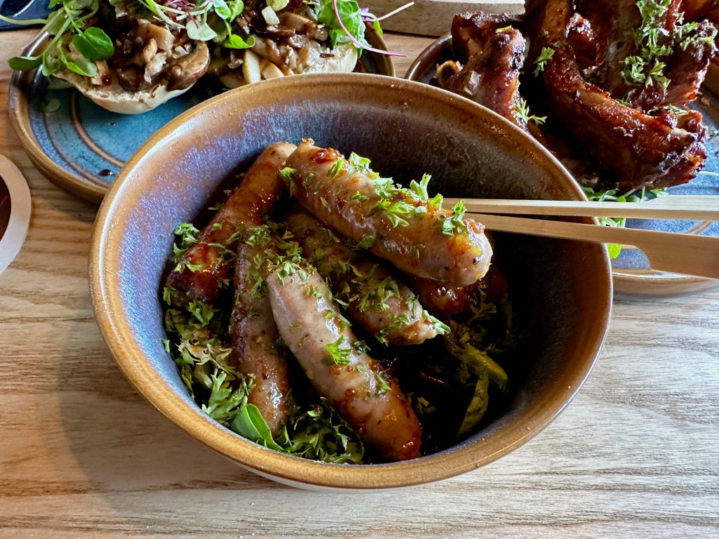 The remainder of our dishes restored the natural order. I had been sniffy about ordering the honey and mustard chipolatas, because in the immortal words of someone (I think it might have been John Inman), I don’t generally go near a sausage unless I’m confident of its provenance. To quote another famous person, my ex-wife used to say that cheap sausages are made up of, and this was her exact phrase, “eyelids and arseholes”.