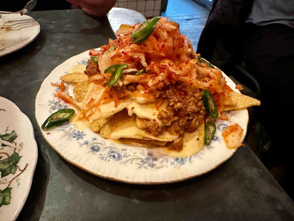 Graeme didn’t offer me any of his loaded fries, for which I can only thank my lucky stars because they were my idea of hell. Slightly wan-looking fries were topped with jalapeños and fried onions – so far so good – and then drowned in a dirty protest of banana yellow squirty cheese. These were called “fully loaded fries” on the menu: I think you’d probably have to be fully loaded to enjoy them.