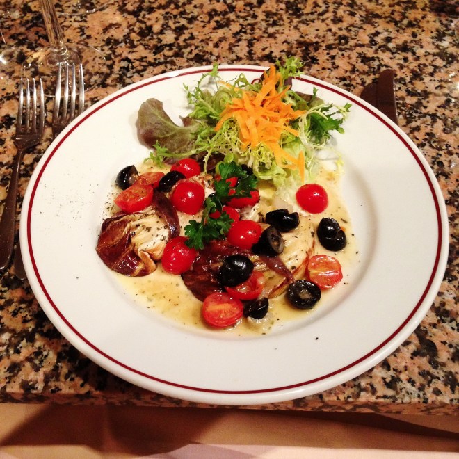 The caponata bruschetta, on the other hand, was as pretty as it was tasty. The caponata itself was lovely – the rich, smoky aubergines were diced and mixed in with tomatoes and pine nuts with a sprinkling of grated ricotta on top. I love the earthy, slightly sweet flavour of caponata and this was a very good one. The bread it came on was less of a success, being tough and difficult to cut (I ended up tearing it with my knife and fork instead). A bit more olive oil or less time under the grill might have been better. Sitting on top of the dish were a couple of small red chillis, barely cooked with their tops chopped off. I genuinely couldn’t fathom what they were doing there – they looked small enough to be properly explosive and I couldn’t see how they fitted in at all. I wondered if it might be some kind of homage to Chili’s – that was the only decent explanation I could come up with. I didn’t eat them.
