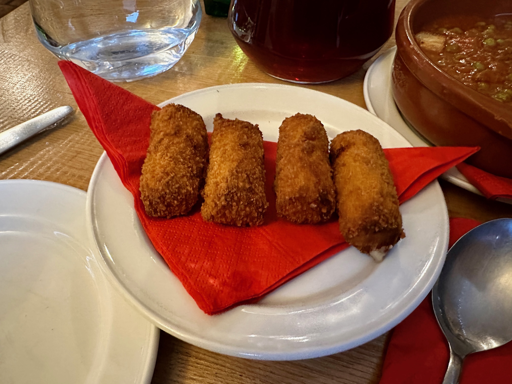 Our last two savoury dishes were, apart from the tortilla, the highlights of the whole thing for me. I am a terrible rubbernecker in restaurants and I kept seeing a dish go past to other tables which looked eminently snackable, a giant heap of fried, crispy, golden things. But I wasn’t sure what it was, and when I asked the manager I couldn’t explain it well enough – I blame the wine – to get him to tell me what the dish was. But then Jerry wanted the prawns, so it turns out we ordered it by accident.