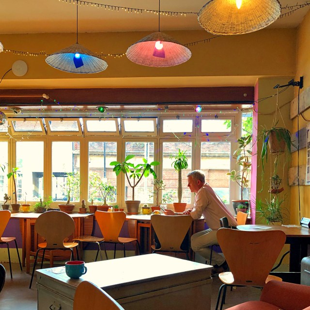 The Global Café hasn’t changed in many years, and I suspect you either think it’s one of the last great Reading institutions or an anachronism you haven’t felt the need to visit for a very long time. I veer more towards the former – even though it’s a tad on the scruffy side I’ve always had a soft spot for it. The area at the front, near the bar, gets lots of light from the lovely big windows and if all the tables and chairs don’t match and don’t seem to be designed for eating at or drinking at, it doesn’t necessarily matter. Nor does it matter that there’s a sofa randomly plonked there, with a big metal trunk serving as a table. It’s Global Café: that’s just how it is.