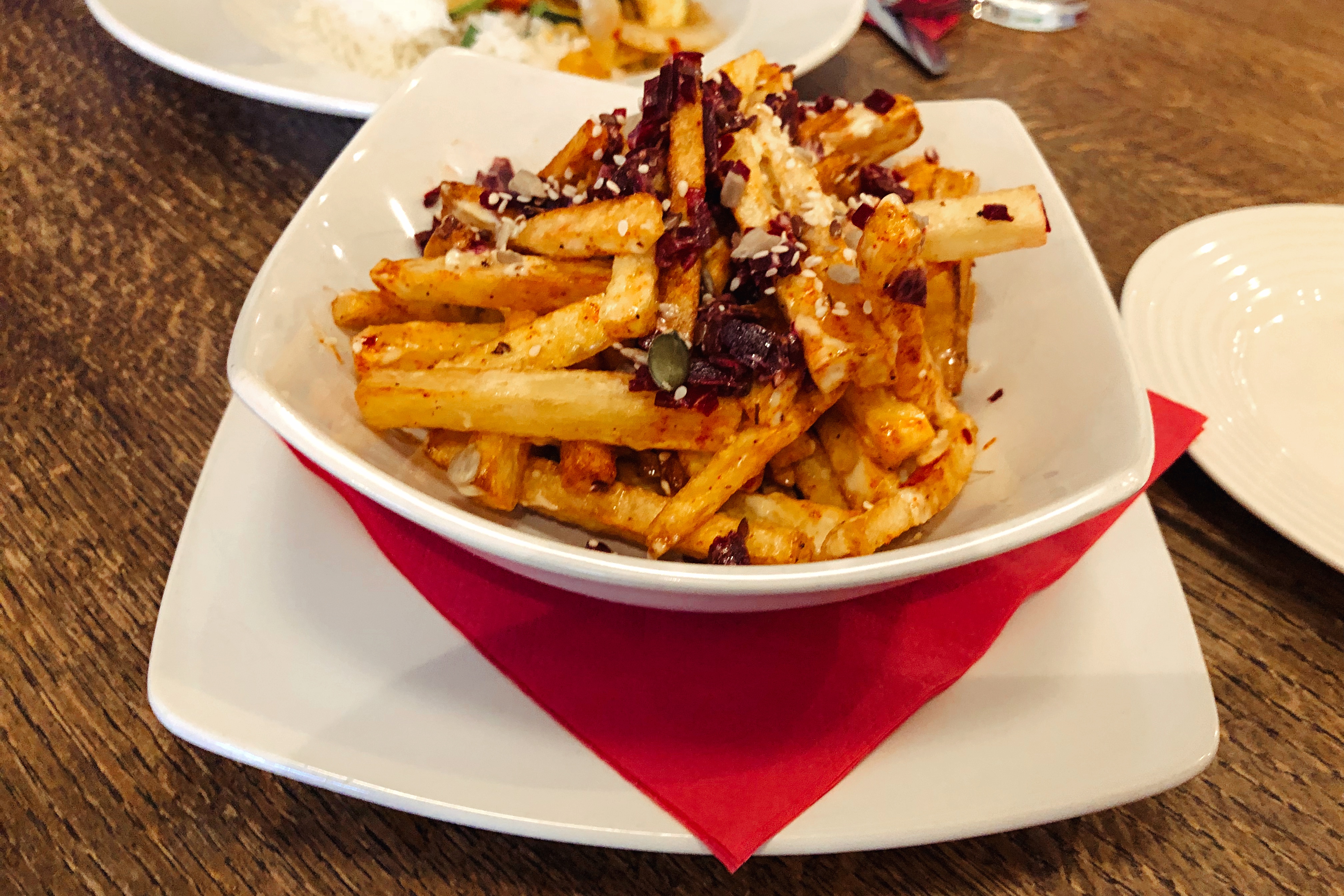 Also, I really liked Global Café Kitchen’s fries – clearly hand-cut and prepared on the premises – and the sweet tomato sauce and (presumably) vegan mayo they came with were both tasty, too. My stepfather had some “dirty fries” although it wasn’t clear what made them so sinful or indulgent: the “beetroot aioli” mainly seemed to be finely diced beetroot and the sesame seeds felt a bit unnecessary. They were still very good, though, because their fries are very good.